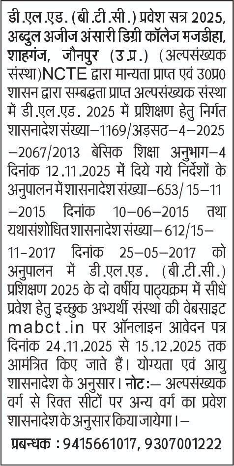 डी.एल.एड. (बी.टी.सी.) प्रवेश सत्र 2025, अब्दुल अजीज अंसारी डिग्री कॉलेज मजडीहा, शाहगंज, जौनपुर (उ.प्र.) |